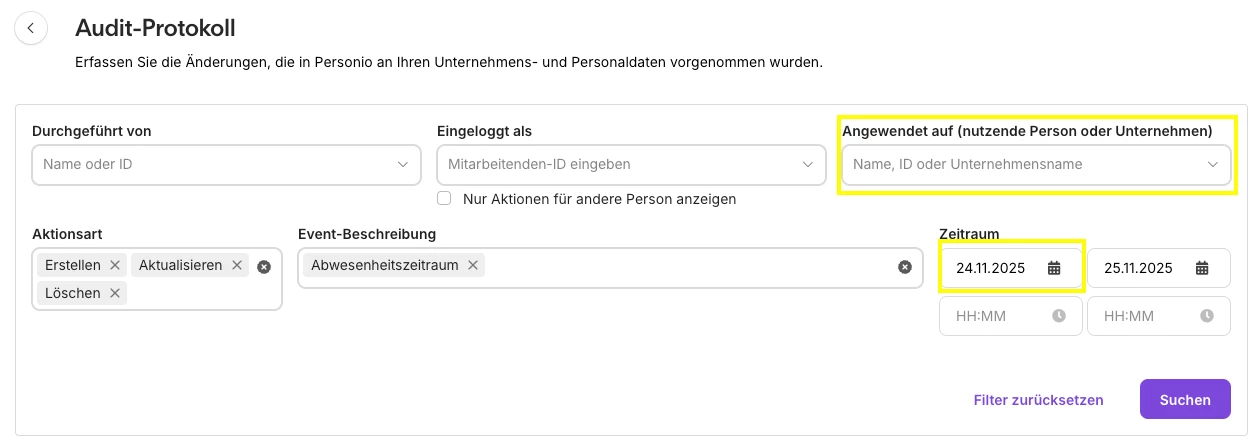 Falls Du auch die Uhrzeit benötigst, findest Du diese über Einstellungen > Audit-Protokoll heraus. Dafür nutzt die folgenden Suchparameter: