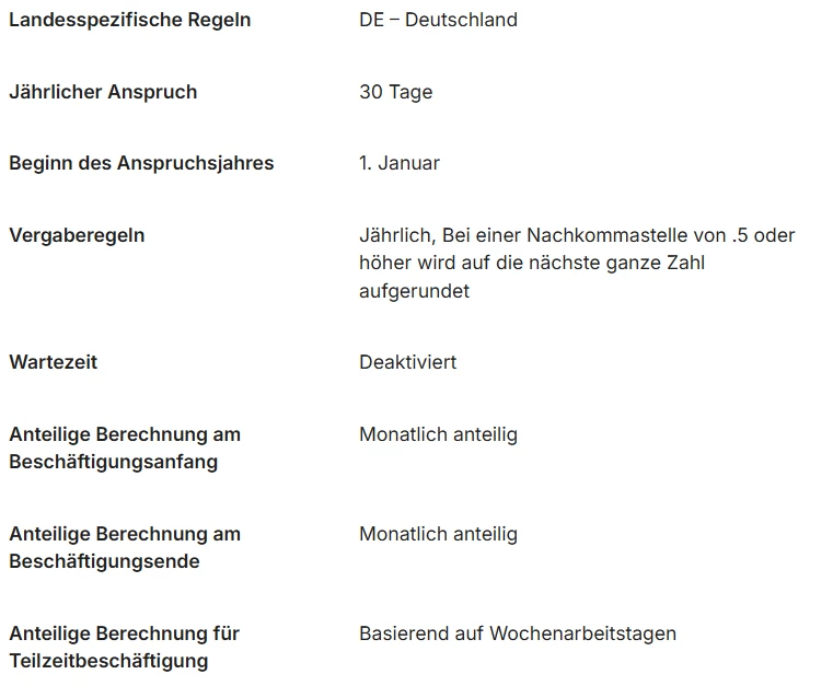 Bei uns hat ein Mitarbeiter der 5 Tage die Woche Arbeitet einen Ansprcuh auf 30 Urlaubstagen und das habe ich bei der Richtline auch so eingestellt, aber wenn ein Mitarbeit 4 Einsatztage hat, dann hat er bei uns eigentlich einen Anspruch von 24 Urlaubstagen.