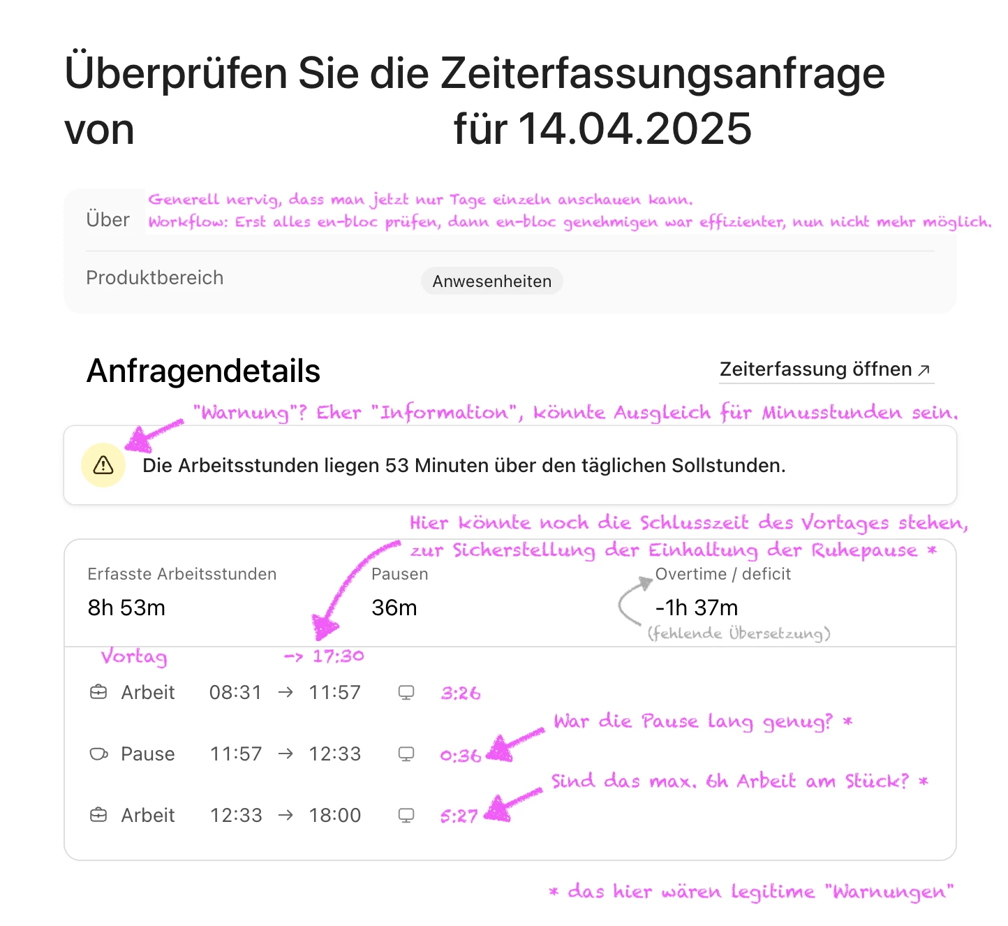 Bei der täglichen Prüfung der Arbeitszeitgenehmigung ist mir Folgendes aufgefallen, was ich gerne als Feedback teilen möchte, anbei habe ich auch noch ein Bild mit den entsprechenden Kommentaren hinzugefügt.