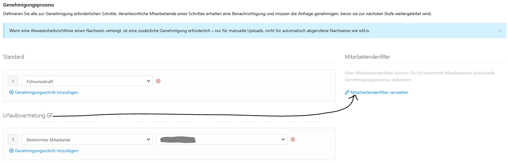 Geschäftsführung ist abwesend, also soll Person X die Abwesenheiten vertretungsweise freigeben. Genehmigungseinstellung: Wenn Führungskraft = GF, dann Freigeber = Person X.