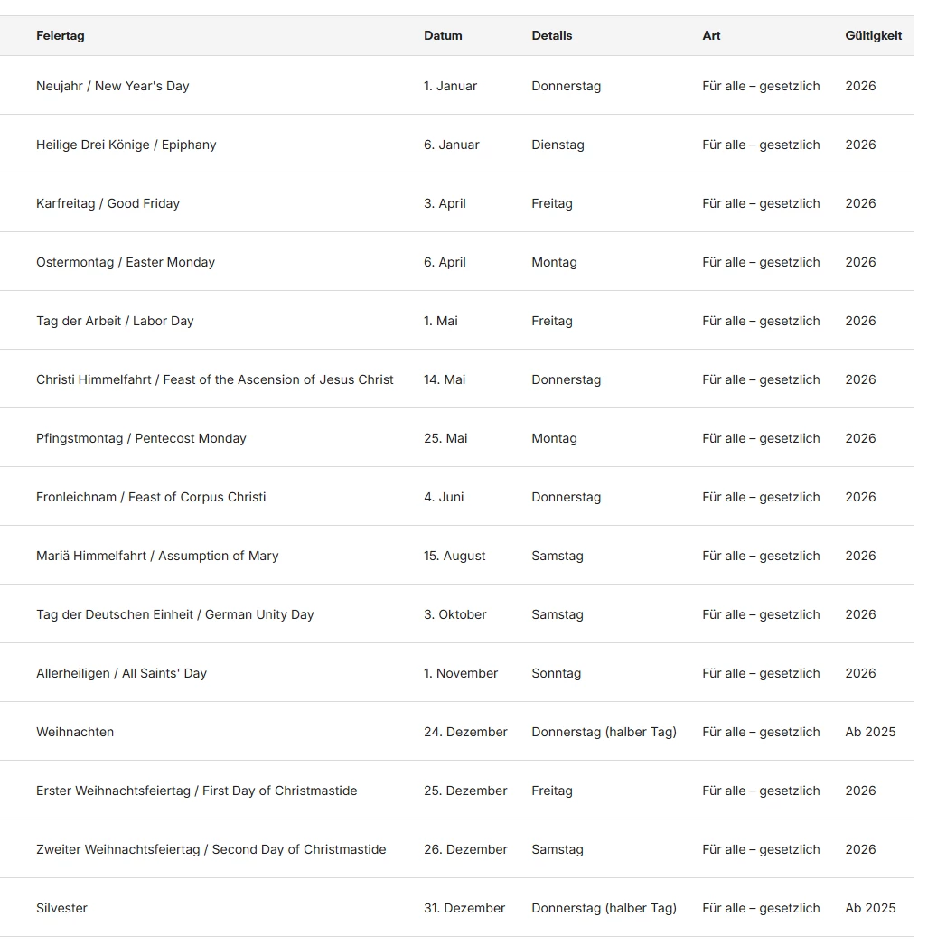 unter “Einstellungen” → “Arbeitszeiten und Abwesenheiten” → “Feiertage” kannst Du die Feiertagskalender bearbeiten und neue Anlegen.