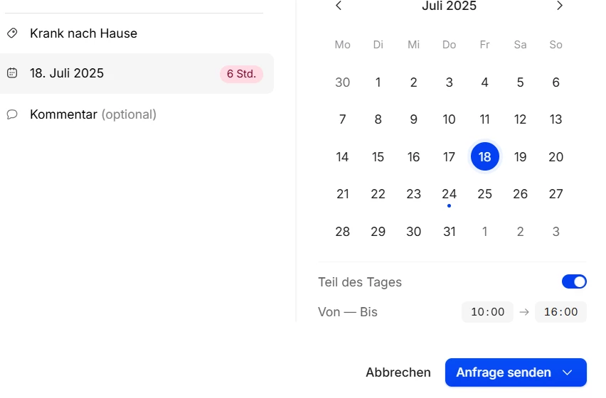 Angenommen Mitarbeiter A hat eine Sollarbeitszeit von 8h: Er arbeitet von 8:00 Uhr bis 10 Uhr und meldet sich danach krank. Dann sollte er eigentlich von Personio automatisch 6h gutgeschrieben bekommen, damit er auf seine Sollarbeitszeit an diesem Tag kommt.