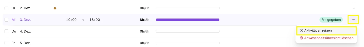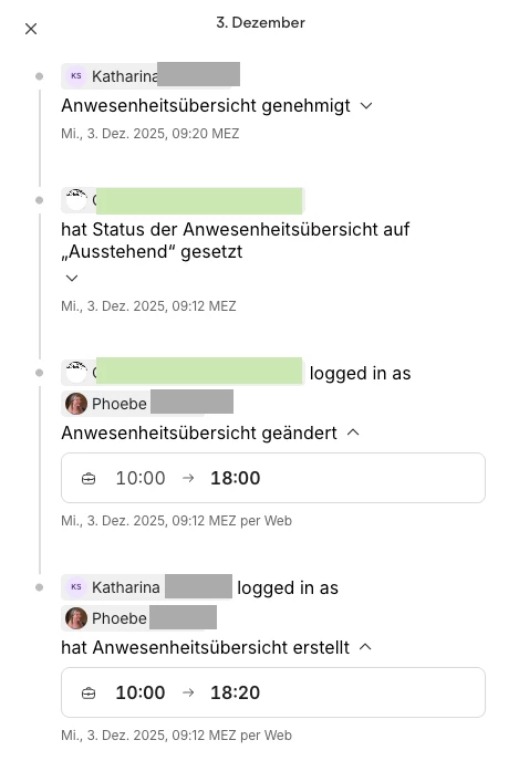 Ich habe weitere Tests durchgeführt und geprüft, ob die ursprünglich erfasste Endzeit in den Aktivitäten angezeigt wird. Die gute Nachricht: Die ursprüngliche Endzeit und alle Bearbeitungen durch das System werden in den Aktivitäten protokolliert. In den Screenshots siehst Du, wie Du darauf zugreifen kannst und wie die Informationen angezeigt werden.
