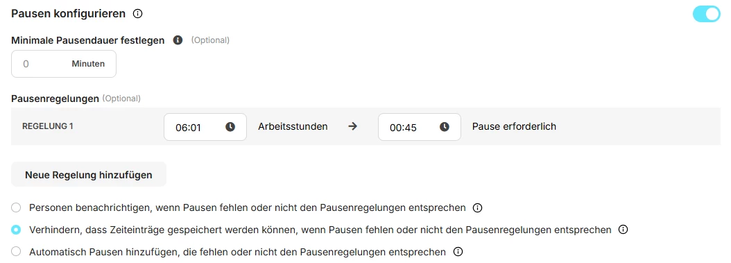 Leider lässt sich das zurzeit tatsächlich nicht ändern. Du könntest hier lediglich einstellen, dass Mitarbeitende nur gewarnt werden, wenn die Pausen nicht stimmen, diese aber nicht automatisch eingetragen/korrigiert werden.