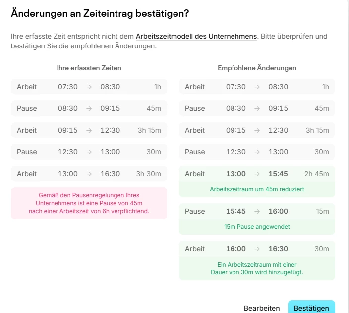 Von 9:15 - 15:45 Uhr sind genau die 6:01 Stunden erreicht worden (mit einer Pause von 30 Minuten zwischendrin). Da in diesem Zeitraum aber nur 30 Minuten Pause fallen, ergänzt das System hier dann die 15 Minuten Pause um 15:45 Uhr. Die 45 Minuten ganz am Anfang des Tages sind für das System hier dann “irrelevant”, weil (erst) danach die 6 Stunden überschritten wurden.