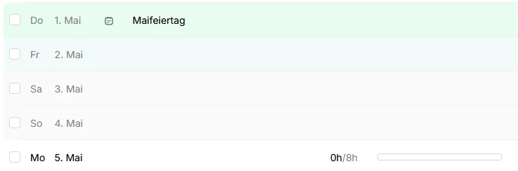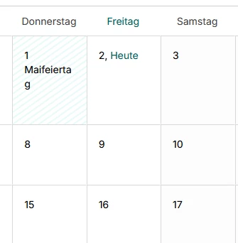 Prima, danke ​@Silvan für die Rückmeldung hierzu. Ja, stimmt, wenn ich genau hinsehe - ganz genau - kann ich eine leichte Einfärbung der freien Tage und des Wochenendes erkennen. Um es User-freundlicher zu gestalten, braucht es jedoch stärkere Akzente, denn schließlich wollen die Leute sehen, wer wann da bzw. verfügbar für Workshops, Projekte etc. ist. Ich bin sicher, das ist auch mit strengen Desing-Vorschriften einher gehen könnte.