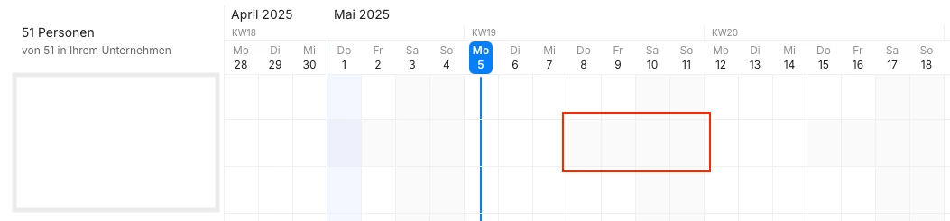 ja genau. Unten ein Screenshot zur Veranschaulichung. Ich habe in meinem Account einen Mitarbeitenden, der nach dem zugewiesenen Arbeitszeitmodell nur Montag bis Mittwoch arbeitet. Also sind die Tage Donnerstag, Freitag, Samstag und Sonntag im Teamkalender ausgegraut.