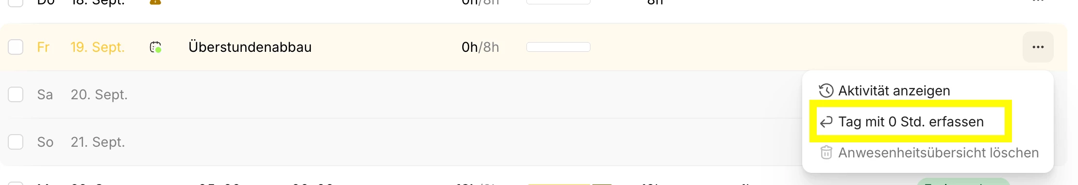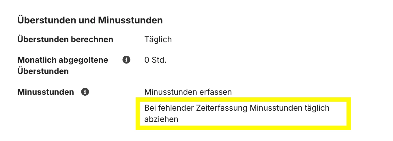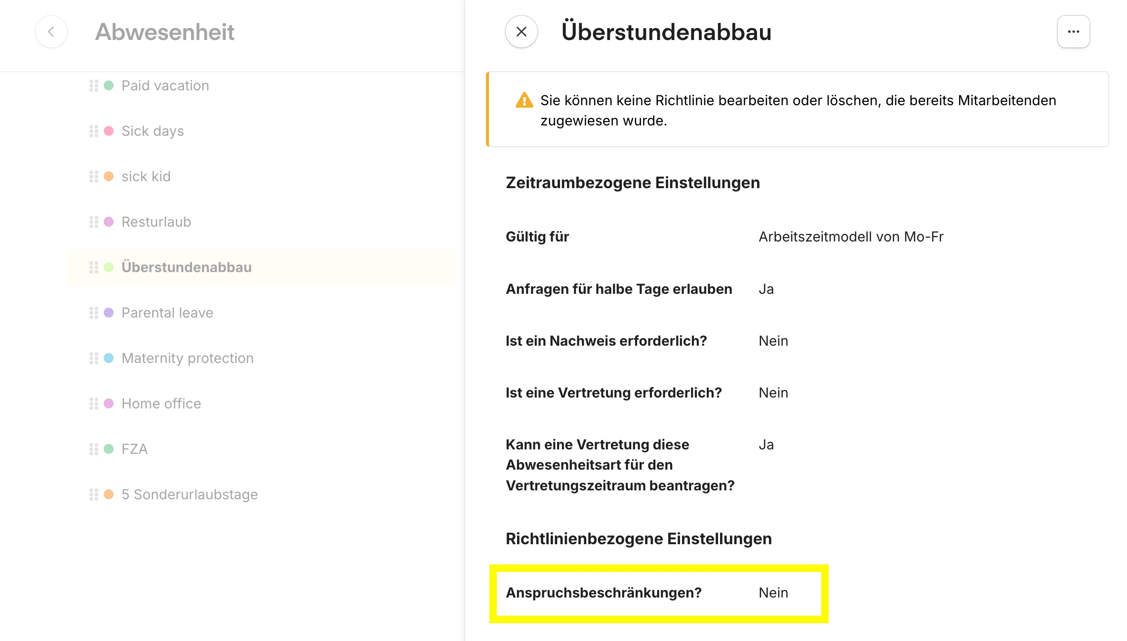 Gibt es irgendwie in den Einstellungen die Möglichkeit, ein Eintragen von Überstundenausgleich zu verhindern, wenn das Kontingent bei der Abwesenheitskategorie 0h ist, also dass Mitarbeitende nicht ins Minus gehen können sozusagen?