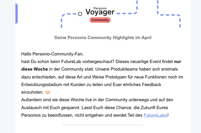 Vom 7. bis 17. April haben wir unser allererstes FutureLab Event veranstaltet – eine kollaborative Initiative, die unsere Community näher an die Produktentwicklung von Personio gebracht hat. Dabei hattet Ihr die Gelegenheit, gemeinsam mit unseren Produktteams neue Ideen zu entwickeln, Prototypen zu testen und Feedback zu geben, das die Zukunft unseres Produkts direkt mitgestaltet.