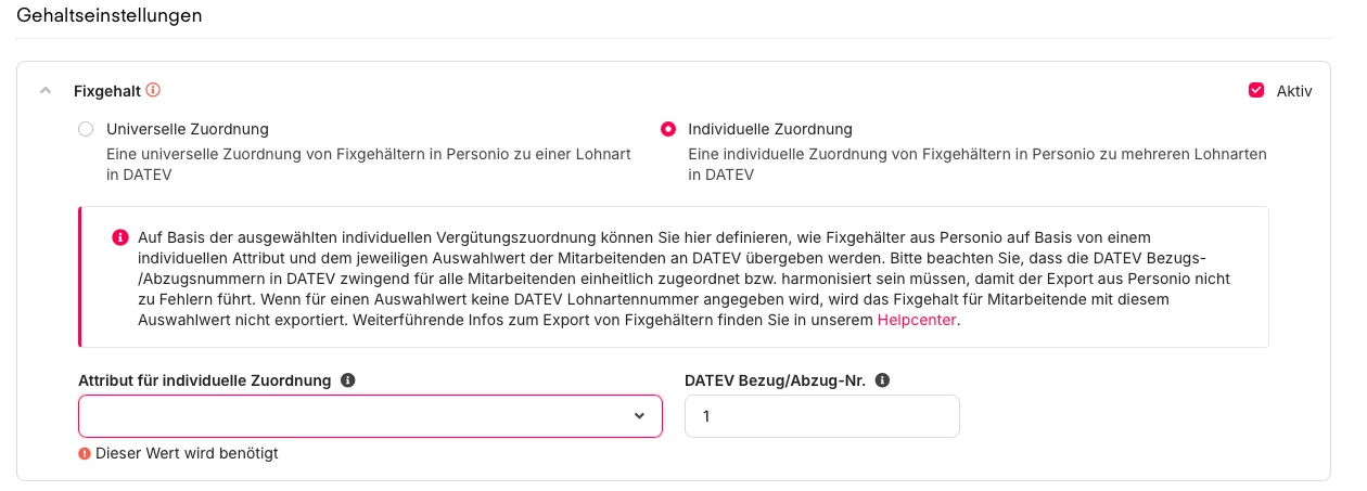 ich würde gerne von der universellen auf die individuelle Zuordnung von Fixgehältern umstellen. Dazu habe ich unter den Mitarbeiterinformationen beim Abschnitt “Daten zur Lohnabrechnung” ein neues Attribut hinterlegt mit den verschiedenen Optionen zur Unterscheidung der “Gehaltsarten”. Soweit so gut, das hat funktioniert. Was ich partout nicht verstehe ist, warum genau dieses neue Attribut in der Auswahl der Individuellen Zuordnung bei den Gehaltseinstellungen der Datev Integration nicht angezeigt wird. Habe ich hier etwas übersehen?