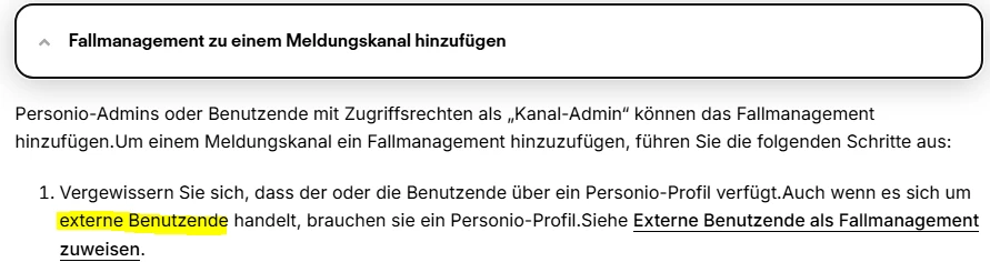 wir haben eine Anwaltskanzlei als externen Anbieter gewählt, diesen aber nicht mit dem Personio-Whistleblowing-Tool verbunden.