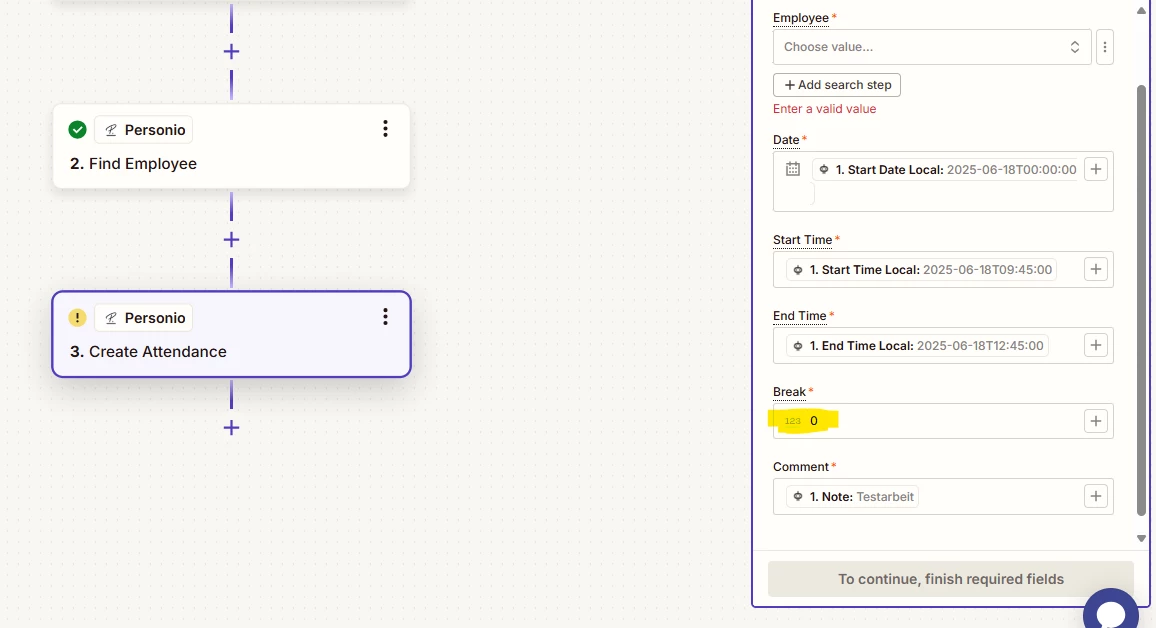 wir versuchen gerade eine Fehlende API-Integration für Anwesenheiten über Zapier abzubilden. Leider stoßen wir immer wieder auf das Problem des fehlerhaften mappings von Personio in Zapier.