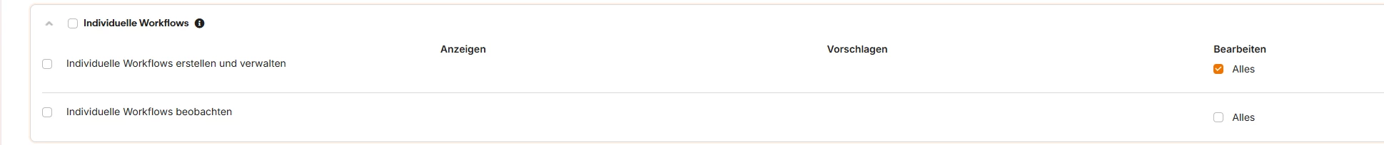 Wenn es um die Workflows geht, dann kannst du in den Mitarbeitendenrollen unter Berechtigungen im Bereich “Individuelle Workflows” den Haken bei “Individuelle Workflows erstellen und verwalten” setzen.