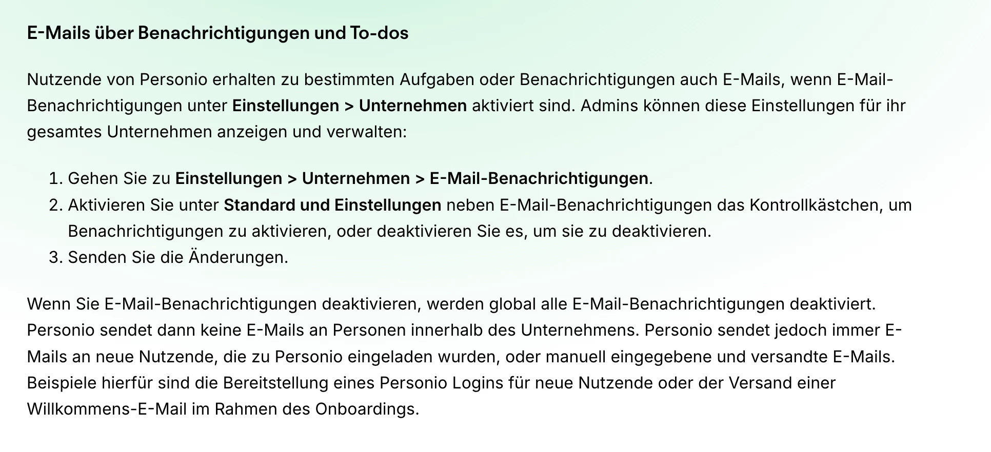 Mein Onboarding-Team erhält die Aufgaben aktuell nur über das Dashboard und nicht per Mail. In den Unternehmenseinstellungen sind Emailbenachrichtigungen aktiviert und auch bei den einzelnen Mitarbeitern sind die Häkchen sowohl bei Dashboard als auch bei Email gesetzt. Hat jemand eine Idee, woran es sonst noch liegen kann? Oder kommen die vielleicht immer nur einmal innerhalb von 24 STunden? Habe die neuen Onboardings gerade erst aufgesetzt, die Aufgaben sind aber schon sofort fällig...
