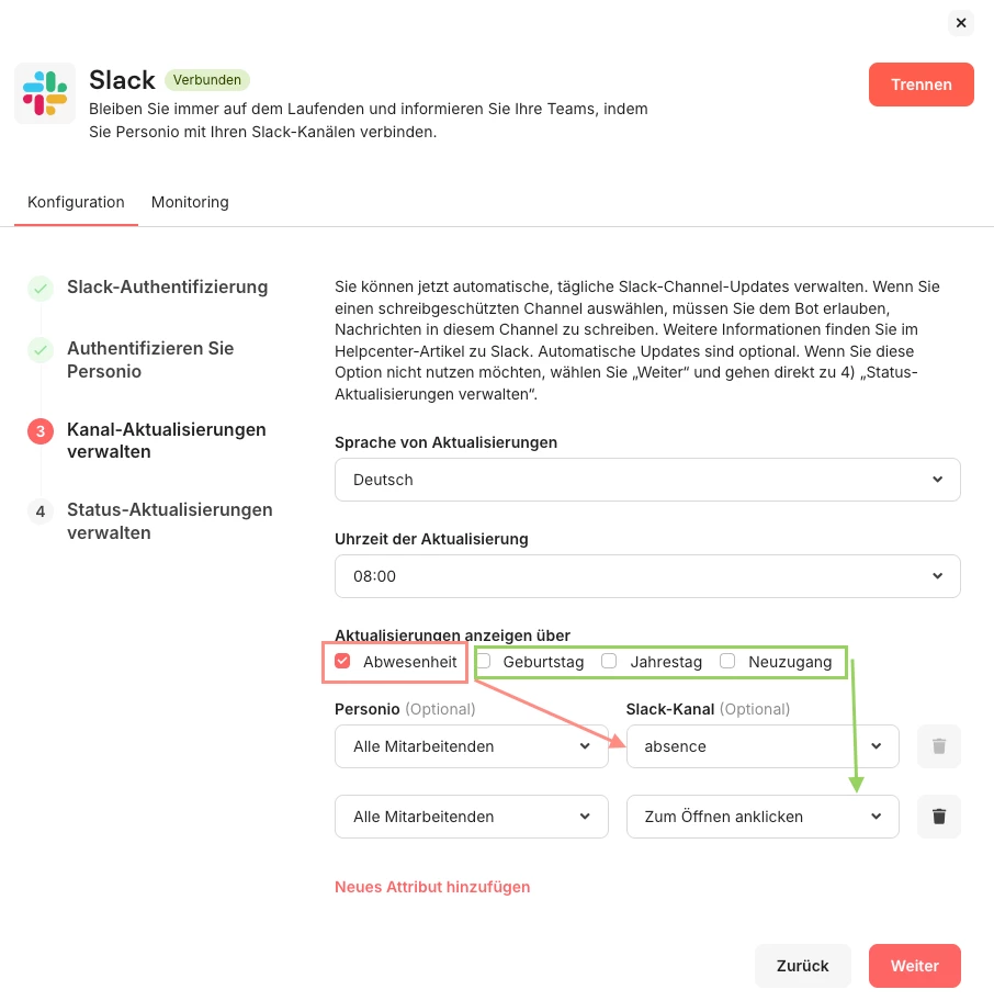 - alle Abwesenheiten, Geburtstage, Neuzugänge und Firmenjubiläen werden täglich in EINEM Slack Channel automatisiert gepostet.