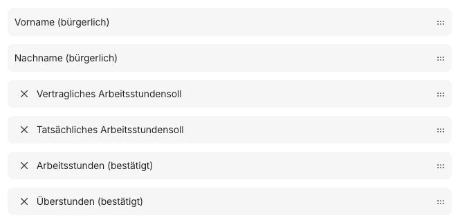 Um die Soll- und Ist-Stunden Deiner Mitarbeitenden auszulesen, empfehle ich Dir folgende Spalten aus Anwesenheit: