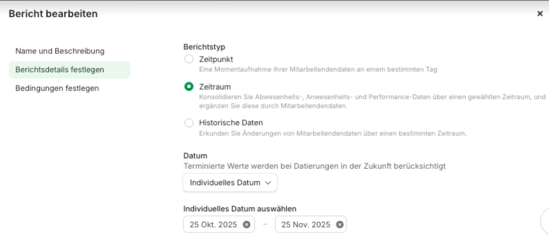 Um die Soll- und Ist-Stunden Deiner Mitarbeitenden auszulesen, empfehle ich Dir einen Custom Report mit einem Zeitraum und einem individuellen Datum zu erstellen. Das Datum hängt davon ab, welche Daten Du abrufen möchtest. Für Oktober-Daten wäre das zum Beispiel 01.10.2025 bis 31.10.2025. Du kannst auch mit einem dynamischen Datum arbeiten, zum Beispiel "Letzter Monat"