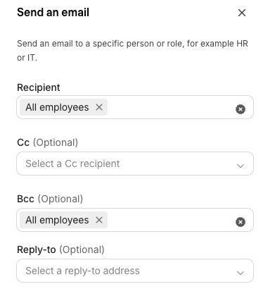Wir haben einen Workflow angelegt, der vor den jeweiligen Deadlines Erinnerungen rausschickt. Allerdings erhalten wir sehr oft Rückfragen, weil mehrere Empfänger in der E-Mail sind. An sich würden gerne alle Empfänger in den BCC setzen, das lässt Personio aber nicht zu, da der Empfänger dann “leer” wäre.