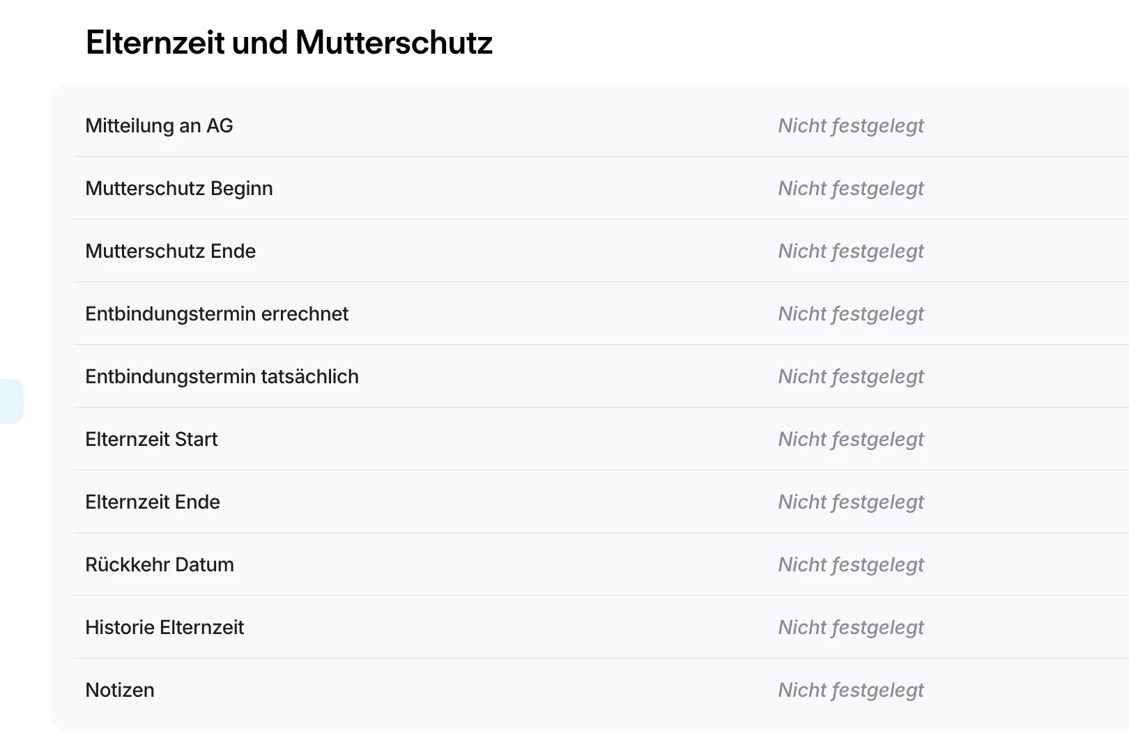 Aktuell nutzen wir die entsprechenden Felder für Mutterschutz und Elternzeit, z. B. für Daten wie Meldung der Schwangerschaft, voraussichtlicher Entbindungstermin, Beginn/Ende Mutterschutz, Elternzeit etc.