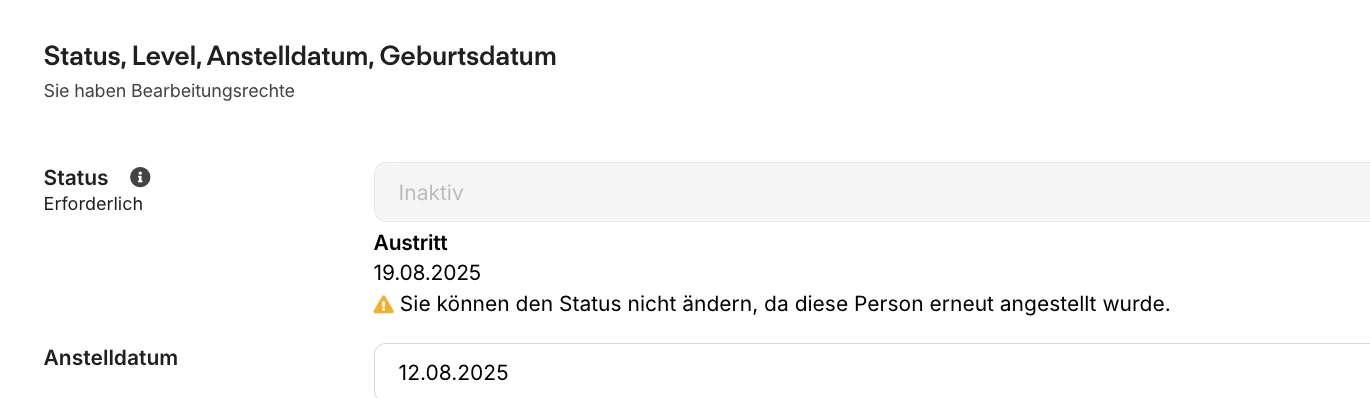 Problem: das alte Profil muss dafür im Status inaktiv sein. Wir könnten also nicht bereits vorher das neue Profil anlegen und ein Oboarding starten - sondern erst zum Änderungsdatum den Austritt hinterlegen und das neue Profil erstellen lassen mit der Funktion des Wiedereintritts. *