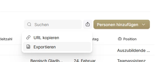 Früher konnte man unter der Mitarbeitendenliste die Attribute “alle markieren”, eine Person auswählen, die Liste in Excel exportieren und die persönlichen Daten wieder löschen.