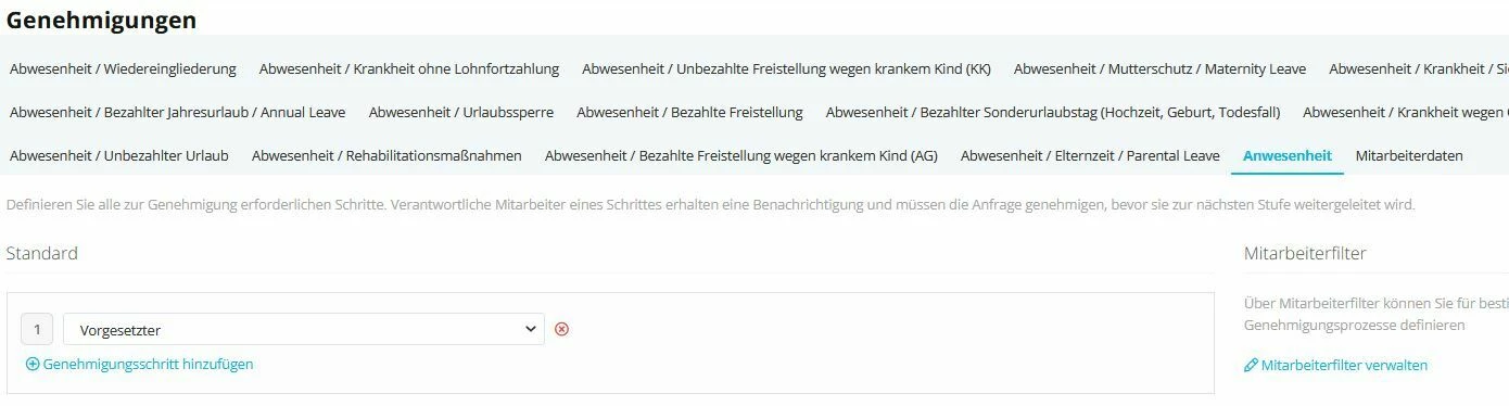 beim Genehmigungsprozess von Anwesenheiten ist der Vorgesetzte hinterlegt.