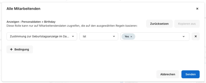 3. Gebt in den Mitarbeitendenrollen Angestellten individuelles Ansichtsrecht auf den Geburtstags-Abschnitt mit der Regel: