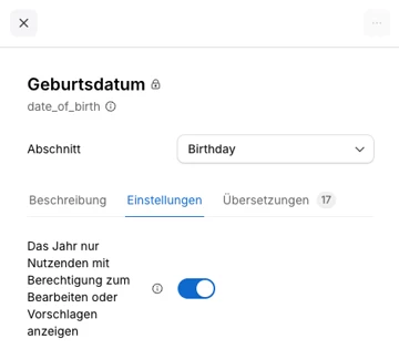 Es gibt in den Attributseinstellungen (Einstellungen > Personen > Mitarbeitendeninformationen) für das Attribut „Geburtsdatum” die Option Das Jahr nur Nutzenden mit Berechtigung zum Bearbeiten oder Vorschlagen anzeigen zu aktivieren: