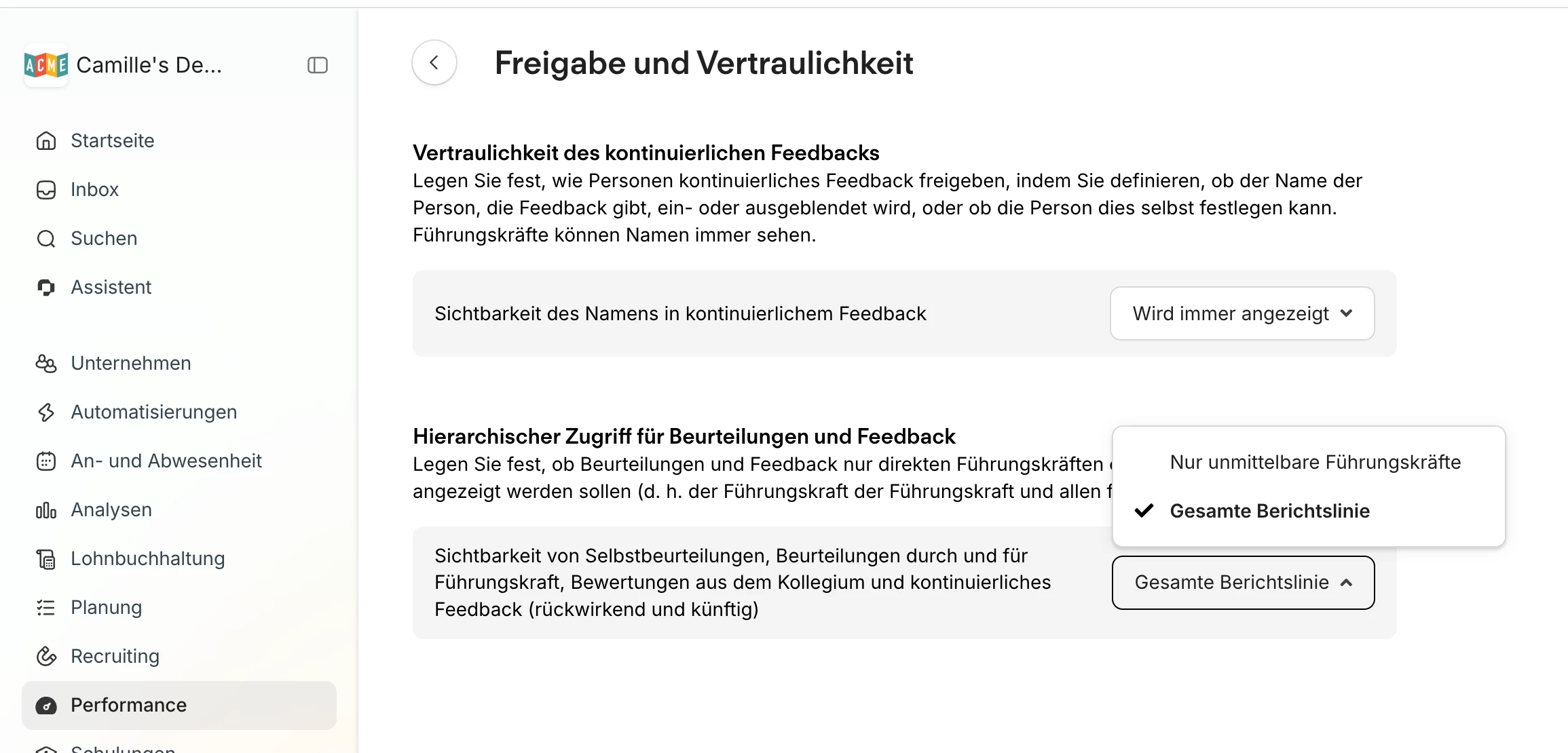 ich bin im Produktteam bei Personio. Ja, Du kannst den Zugriff für Deine Abteilungsleiter*innen konfigurieren, indem Du zu Performance & Entwicklung --> Einstellungen --> Freigabe und Vertraulichkeit gehst und den Zugriff unter Hierarchischer Zugriff für Beurteilungen und Feedback konfigurierst. Entschuldige bitte, dass Du nicht früher eine Antwort erhalten hast!