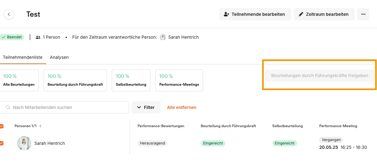 Da beide Beurteilungen vorlegen, habe ich den Zeitraum geschlossen und möchte jetzt die Beurteilung durch Führungskraft freigeben. Allerdings ist der Button asgegraut und lässt sich auch durch anhaken meiner Person nicht aktivieren.