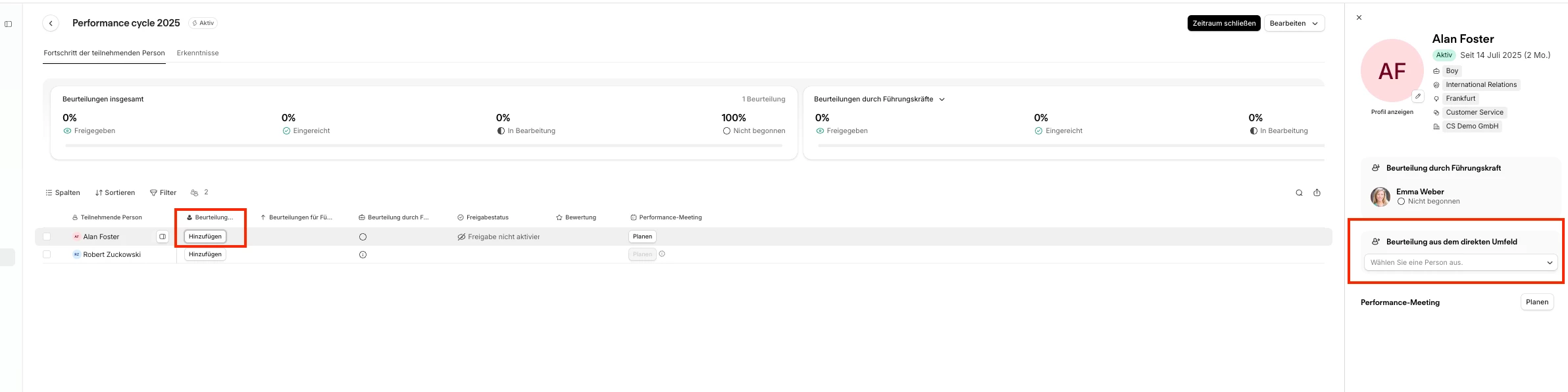 wenn Du die Aktivität “Beurteilung aus dem direkten Umfeld” nutzt, kannst Du die Peers zuweisen, sobald der Zeitraum aktiv und die Aktivität gestartet ist.
