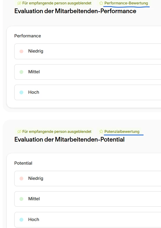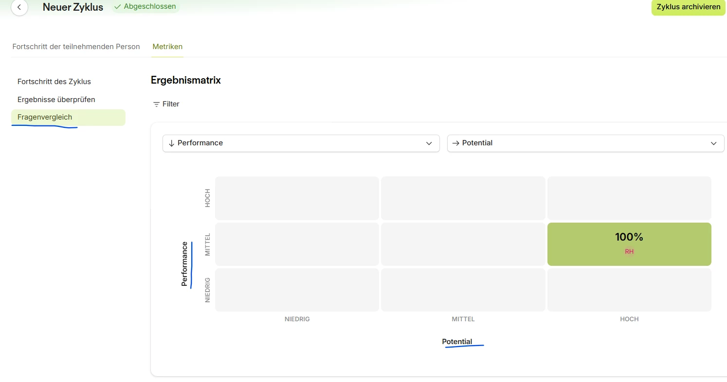 bei der neuen Funktion, mit der man die Performance und das Potenzial eines Mitarbeitenden bewerten kann, wird das Ergebnis im Beurteilungszyklus bei den Metriken im “Fragenvergleich” dargestellt. Allerdings werden hier Performance und Potential auf der jeweils falschen Achse dargestellt. Dieses Model wird in der Regel so dargestellt, dass auf der x-Achse (also Verlauf nach rechts) die Performance dargestellt wird und auf der y-Achse (Verlauf nach oben) das Potenzial. Ich kann zwar die Achsenbeschriftung ändern, aber bei den Grundeinstellungen ist die Voreinstellung von Personio bereits falsch herum, so dass es hier vermutlich zu Fehlern kommen würde, wenn ich es in der Überschrift zwar richtig schreiben würde, aber der Oberbegriff dann genau der falsche ist. Ich habe es blau unterstrichen. Übersehe ich hier eine Einstellmöglichkeit oder liegt hier ein Bug vor?