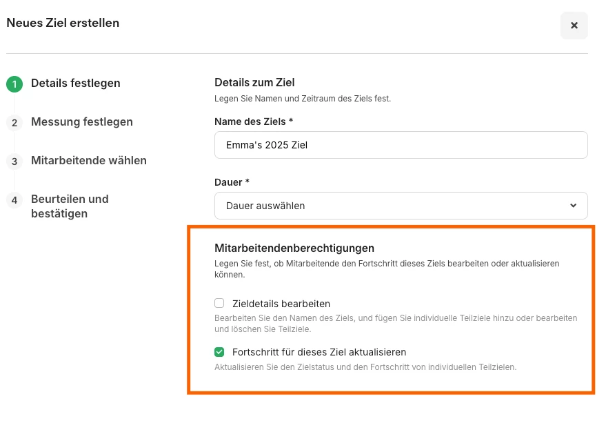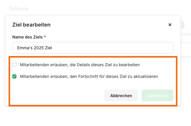 wir haben das Performance Paket recht neu und wollen nun erstmals die Zielerreichungen in Personio tracken. Standardmäßig ist es so eingestellt, dass die Mitarbeitenden ihren Zielfortschritt eigenständig aktualisieren können. Wir würden es aber gerne so einstellen, dass nur die jeweilige Führungskraft den Fortschritt aktualisieren kann. Wie können wir das umsetzen?