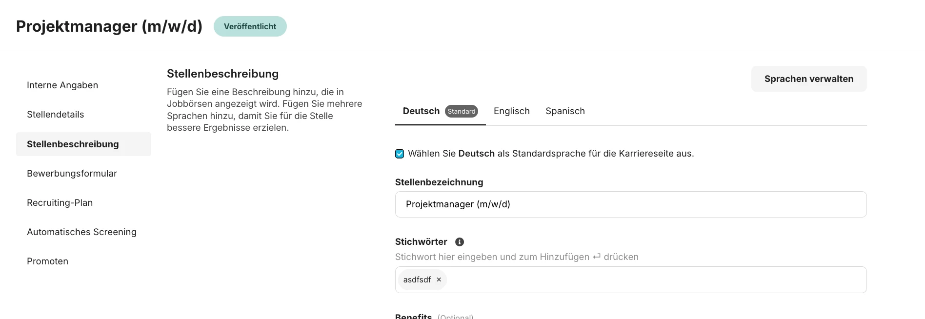 gerade bin ich dabei unsere Stellenanzeige auch auf englisch zu übersetzen. Formular und Stellenanzeige sind nun wahlweise deutsch oder englisch zu lesen, nur die Jobbezeichnung bleibt auf deutsch. Könnt ihr mir helfen? Ich weiß nicht wo ich noch etwas anders einstellen soll.