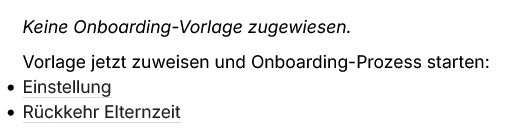 Mein erster und logischster Gedanke hierzu ist, eine einfache Vorlage zu erstellen und genau wie in On/Offboarding vorzugehen. Da diese Wiedereintritte mit vielen Abteilungen, Arbeitsschritten und Informationen wie zb. Urlaubsansprüchen, erster Arbeitstag, evtl. neuer Einsatzbereich, neue Führungskraft, neues Team usw. zusammenhängen wäre das aus meiner Sicht die einfachste und sicherste Lösung jedem Beteiligten über genau solche Vorlagen seine Schritte zuzuordnen. Leider scheint es diese Möglichkeit nicht zu geben.