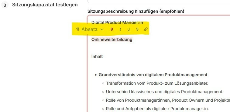 seit einiger Zeit kann ich im Bereich Schulungen keine vernünftig formatierten Sitzungen mehr erstellen.