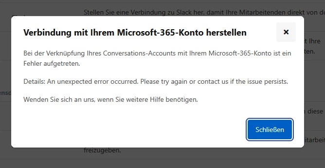 Hi ​@mku , das war bei uns auch so (IT Support wollte die Integration umsetzen und ist an dieser Stelle mit dem “unexpected error” gescheitert). Konntet ihr das inzwischen lösen?